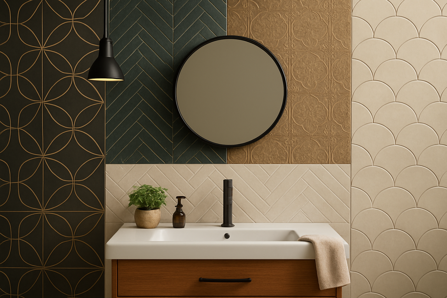 Your fixture finishes should enhance rather than compete with tiles. Matte black fixtures pair beautifully with glossy tiles, while warm brass complements earthy ceramic tiles. Glossy glazed ceramic wall tiles reflect light, brightening smaller bathrooms, while matte finishes create intimate atmospheres.